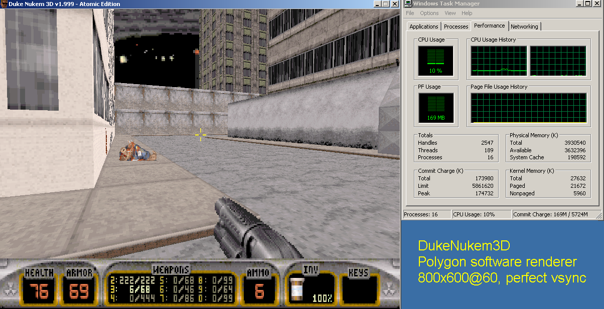 I also modified DukeNukem3D to use my vsync method, to get perfect frame lock I modified the game timer code, replacing the calls to QueryPeformanceCounter with an artificial time derived from the frame counter. With the polygon software renderer, windowed at 800x600@60 the cpu usage with perfect vsync was ~10%. Full screen 800x600@120 was around 30%.